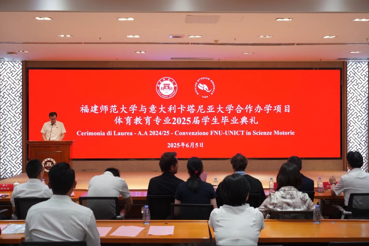6月5日上午,体育科学学院在宏达厅隆重举行福建师范大学与意大利卡塔尼亚大学合作办学项目体育教育专业2025届学生毕业典礼。意大利卡塔尼亚大学生物医学和生物技术学院、体育科学学院院长朱塞佩·穆苏梅奇教授,萨姆艾勒·托马斯教授,卡罗杰洛·马里欧·布里威教授,白薇老师,校学生工作部部长颜隆忠、教务处处长杨发福,学院党政工领导、专业负责人、系主任、教研室主任、科级干部和教师代表、体育教育(中外合作项目)专业2025届全体毕业生及家长代表参加典礼。典礼由学院党委副书记罗毅主持。